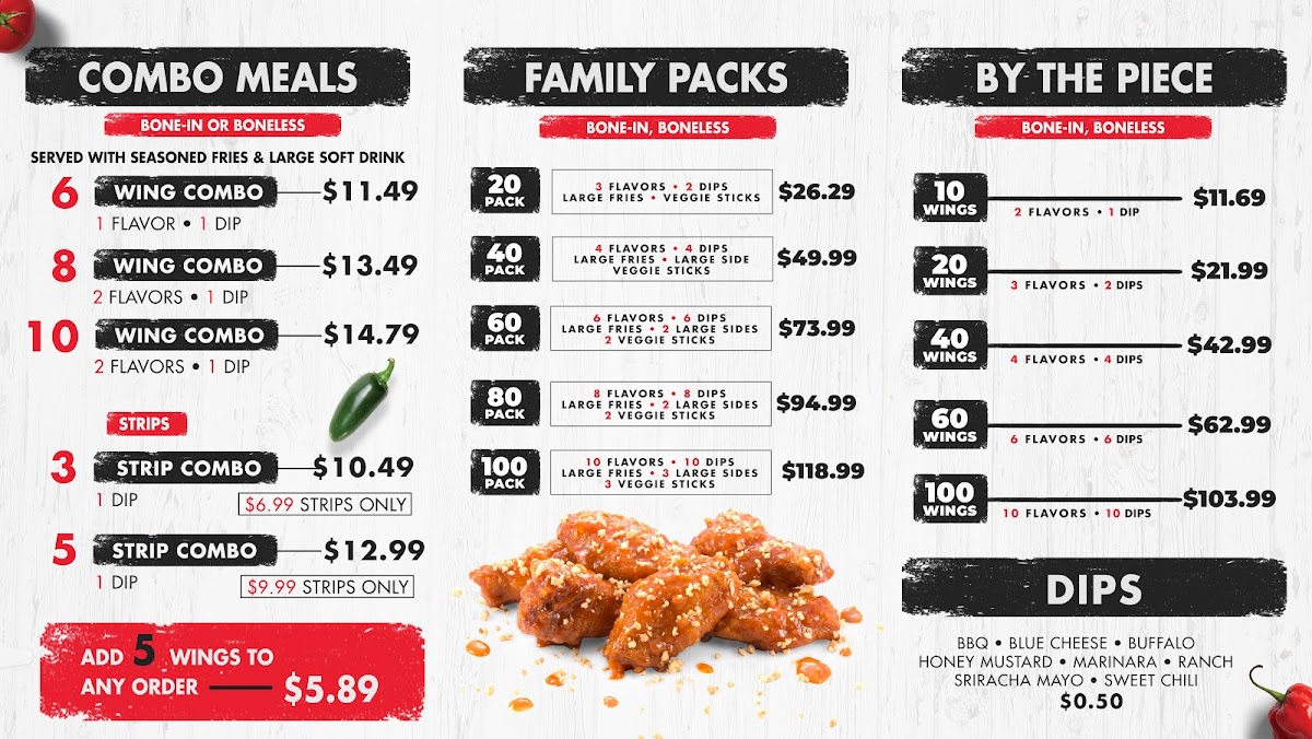 Introducing the menu at Fire Wings - San Jose is a guaranteed flavor explosion for chicken lovers! Located in the heart of San Jose, this vibrant wing franchise features an impressive variety of wing flavors, inviting you to customize your selection. Start with wings available by the piece, choosing from options like Saigon Street, Lemon Pepper, and more!